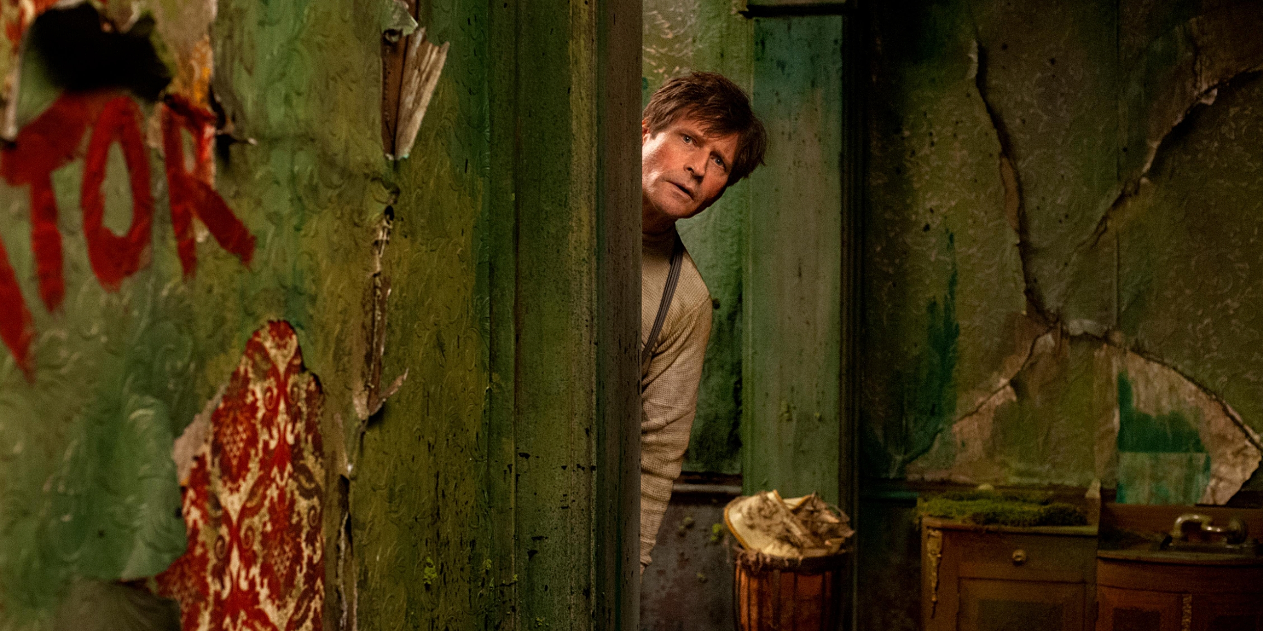 The jauntiness of Stijn Cole’s score and the lushness of its visuals is what first attracts the viewer to “Mr. K,” a tale about a magician down on his luck. The color green is most prominent and symbolic of Schwab’s theme of life. At first, the visuals are bright but fade as the film progresses, much like the score, taking on dark undertones. Mr. K travels to a grand hotel, hoping to stay the night before his next gig. It’s a decaying shadow of its former self, much like Mr. K. While the hotel’s mossy green walls may be fading, what’s keeping this place vibrant is its colorful cast of characters, which includes a hostile front desk clerk with one good eye (Barbara Sarafian), a disheveled man who’s constantly trying to sleep in Mr. K’s room (Sam Louwyck), a troupe of musicians led by a glamorous maestra (Sunnyi Melles), a bustling kitchen staff with a hardened chef (Bjørn Sundquist), and two elegant, elderly sisters (Fionnula Flanagan and Dearbhla Molloy) who provide a sense of solace from the chaos Mr. K finds himself in.